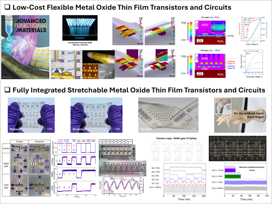 Our research focuses on oxide semiconductor thin-film transistors (TFTs) for flexible and stretchable platforms, including advanced substrate engineering, liquid-metal-based stretchable interconnects, and high-performance, high-reliability short-channel oxide backplane architectures for ultra-high-resolution displays. These technologies are well suited for technology transfer and collaborative research in flexible displays, wearable sensors, curved automotive displays, and next-generation backplane process development.