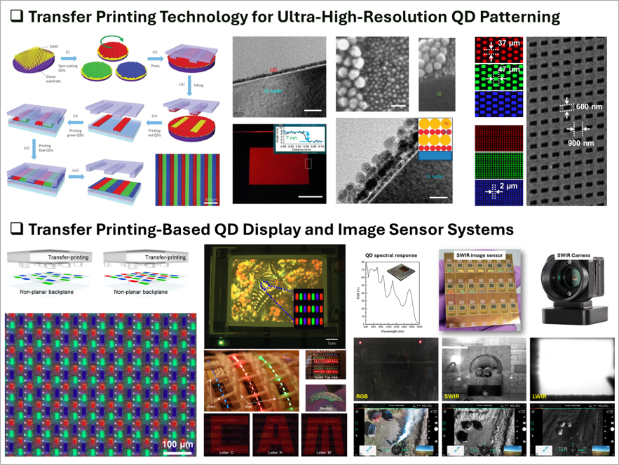 Our laboratory develops novel transfer-printing-based fabrication technologies, including Cracking-Assisted Transfer Printing (CATP), aiming to realize ultra-high-resolution (>16,000 ppi), cadmium-free QD-LED displays. These technologies are directly applicable to industrial research and development, including QD material and process optimization, high-resolution display panel fabrication, and QD-based photodetectors for image sensor applications.