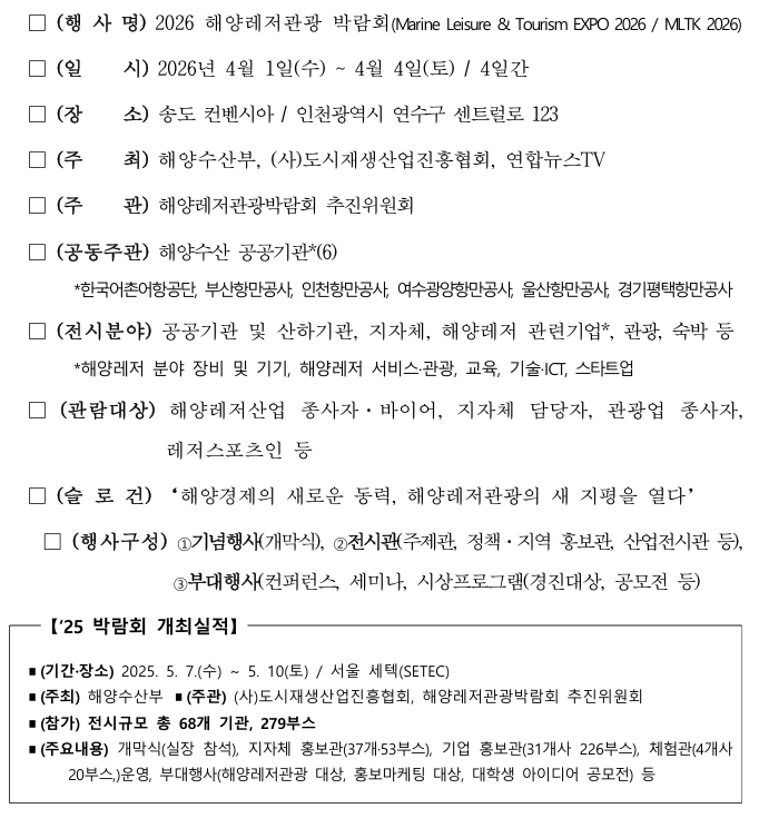 해양수산부 "2026 해양레저관광 박람회" 참여 안내 (4.1~4.4. 송도 컨벤시아)