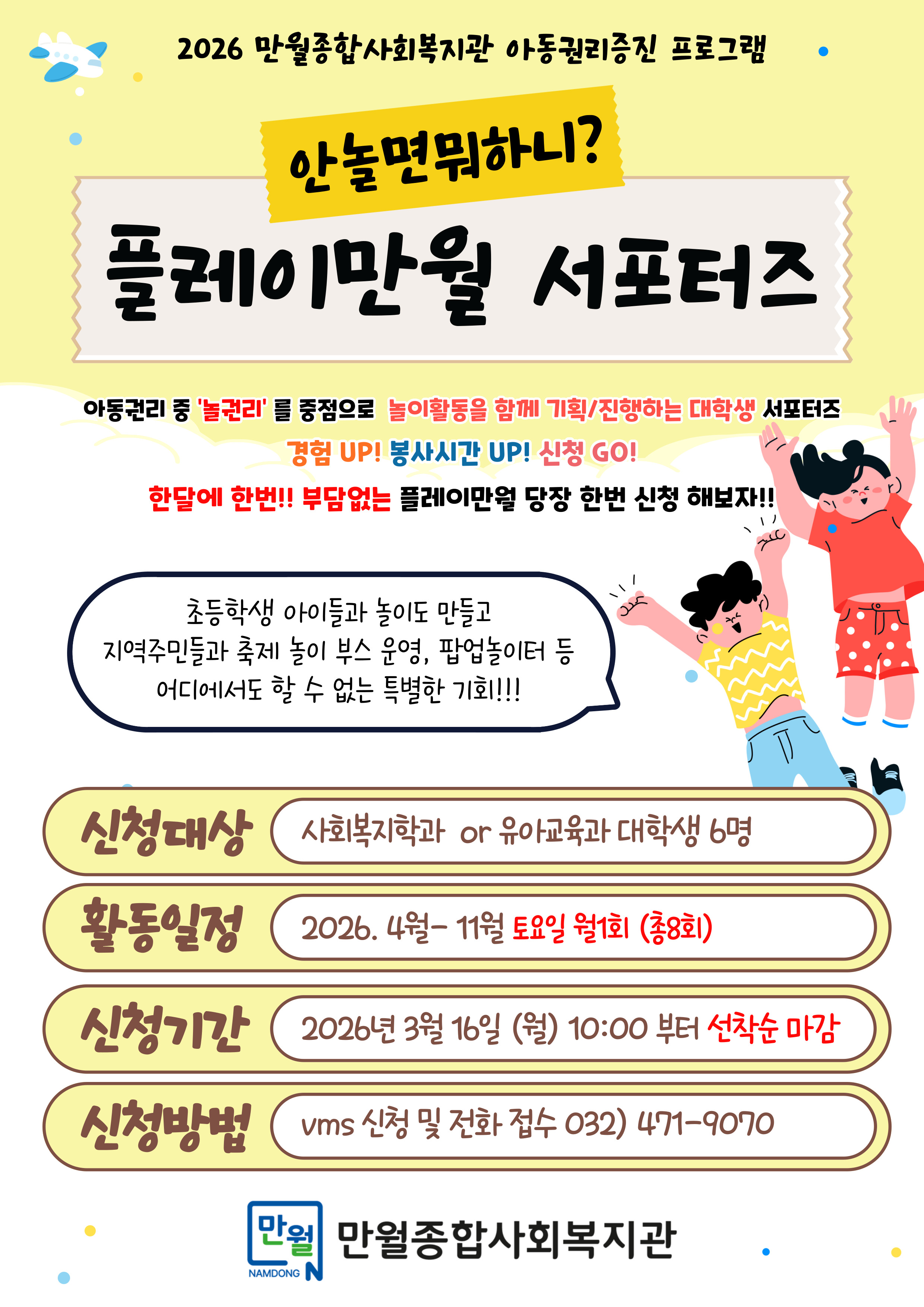 fnctId=bbs,fnctNo=747 [만월종합사회복지관] 2026년 플레이만월 서포터즈 모집 안내 글번호 421287 작성일 2026-03-17 수정일 2026-03-17 작성자 사회복지학과 (0328358311) 조회수 33 첨부파일 플레이만월-서포터즈-모집 홍보지.jpg 다음글 이전글 [시흥시노인종합복지관] 2026년 사회복지 기금마련 바자회 '늠내골 나눔장터' 자원봉사자 모집안내 전시현 2026-03-13 15:38:13.0 목록