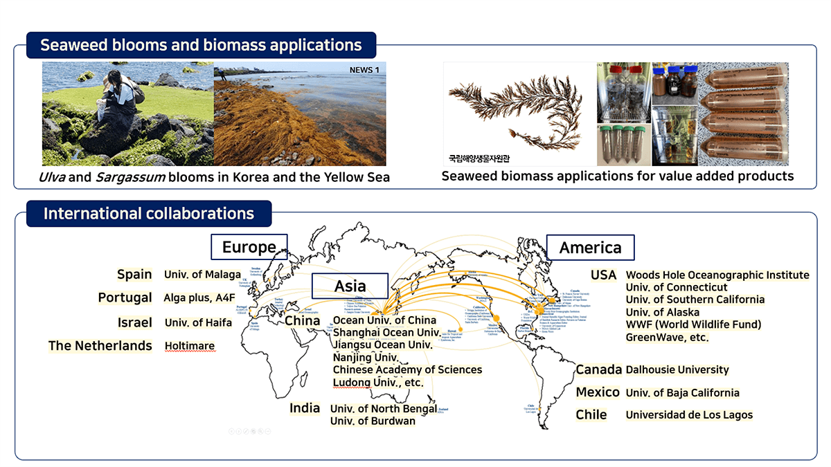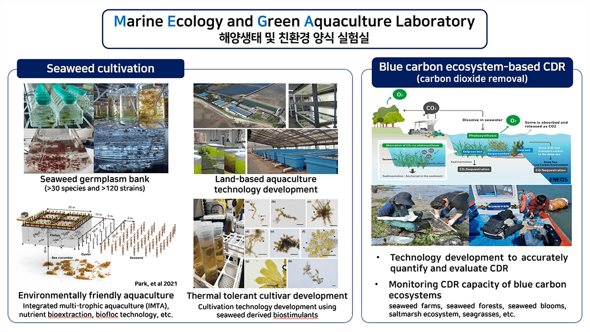 해양생태및친환경양식연구실 Marine Ecology and Green Aquaculture laboratory 교수명 김장균 교수님 주전공 해양생물, 해양생태, 해조류 양식, 친환경생태양식, 블루카본 담당교과목 일반생물학(1), 일반생물학(2), 해양생태및실험, 양식과환경 연락처 032-835-0321 위치 5호관 441호 Homepage 홈페이지 바로가기 연구분야
